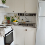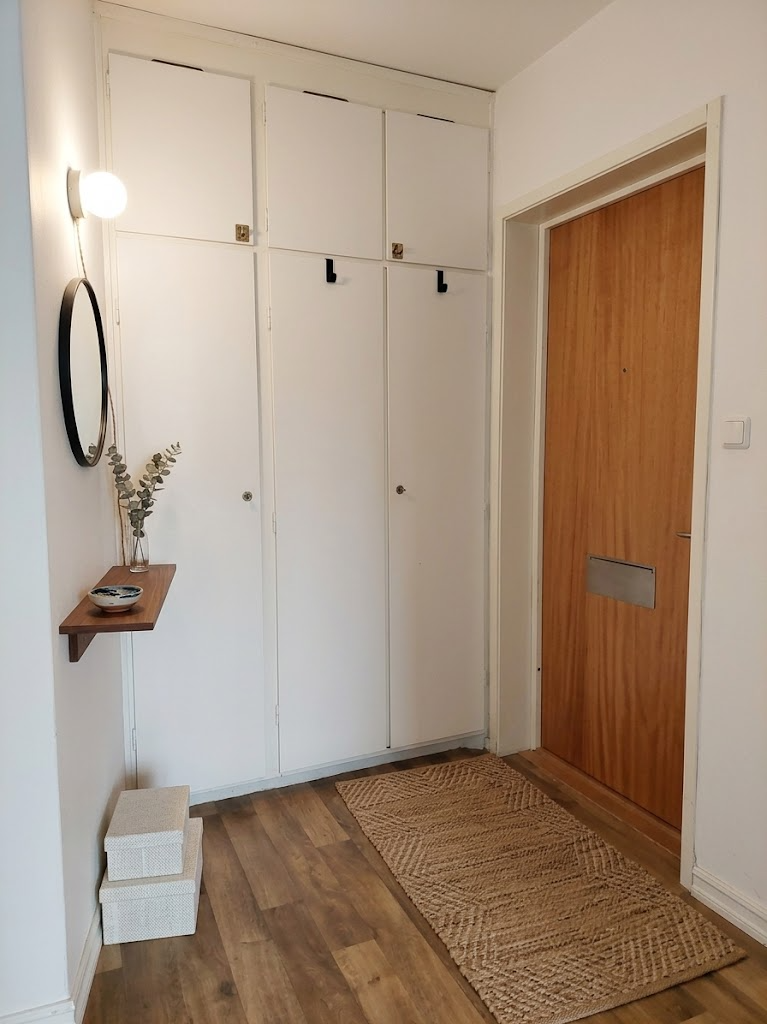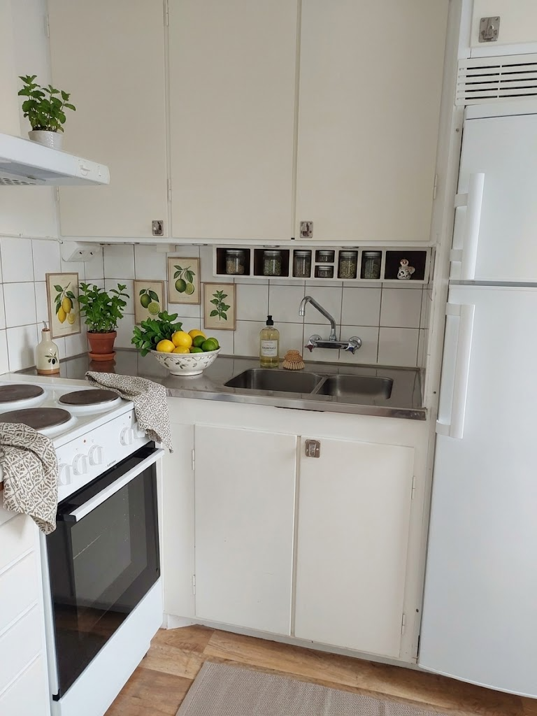 Lägenheten har vitmålade väggar och nya golv. Badrum med badkar. Kokvrå med gott om plats för matmöbel i det rymliga vardagsrummet.
